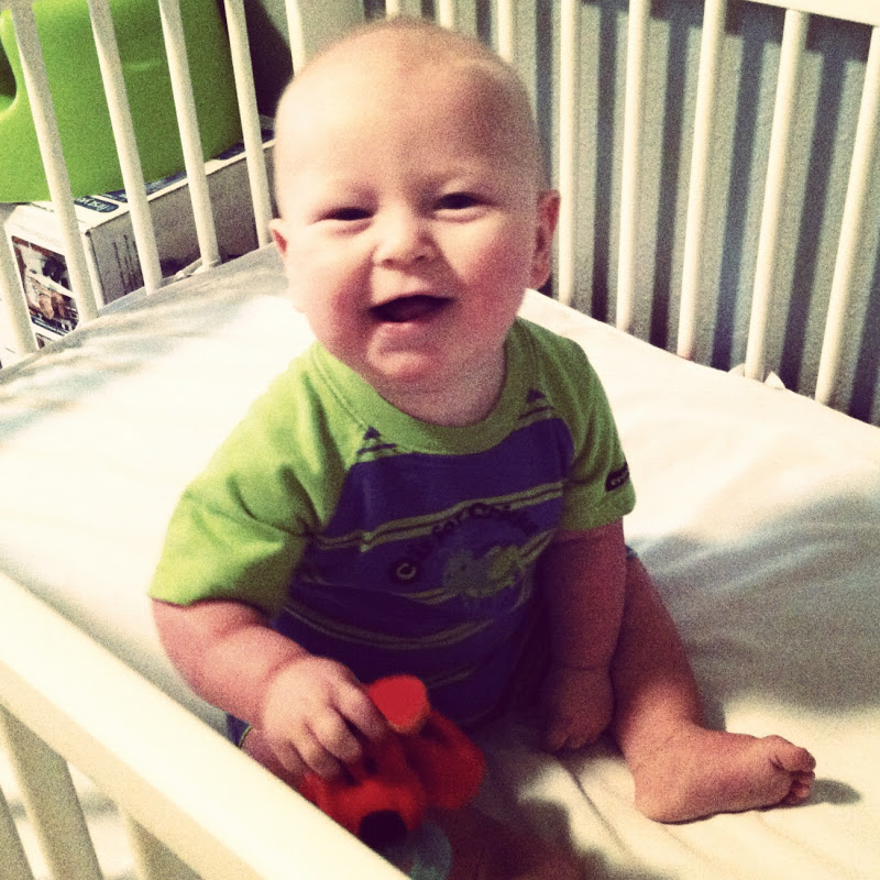 This month you started rolling all over the floor, and each day you improved at sitting. You started pulling up on me ALL THE TIME, and then you started pulling up in your crib, too! You look SO cute when you stand up, but it scares me! I'm not ready for you to be running all around, and I know it will be here before we know it!